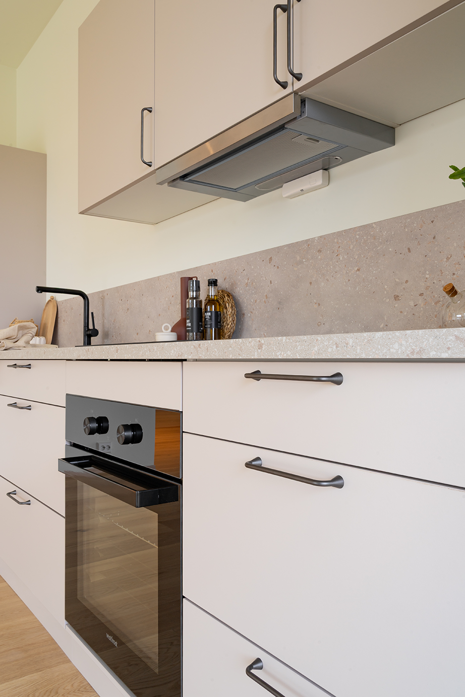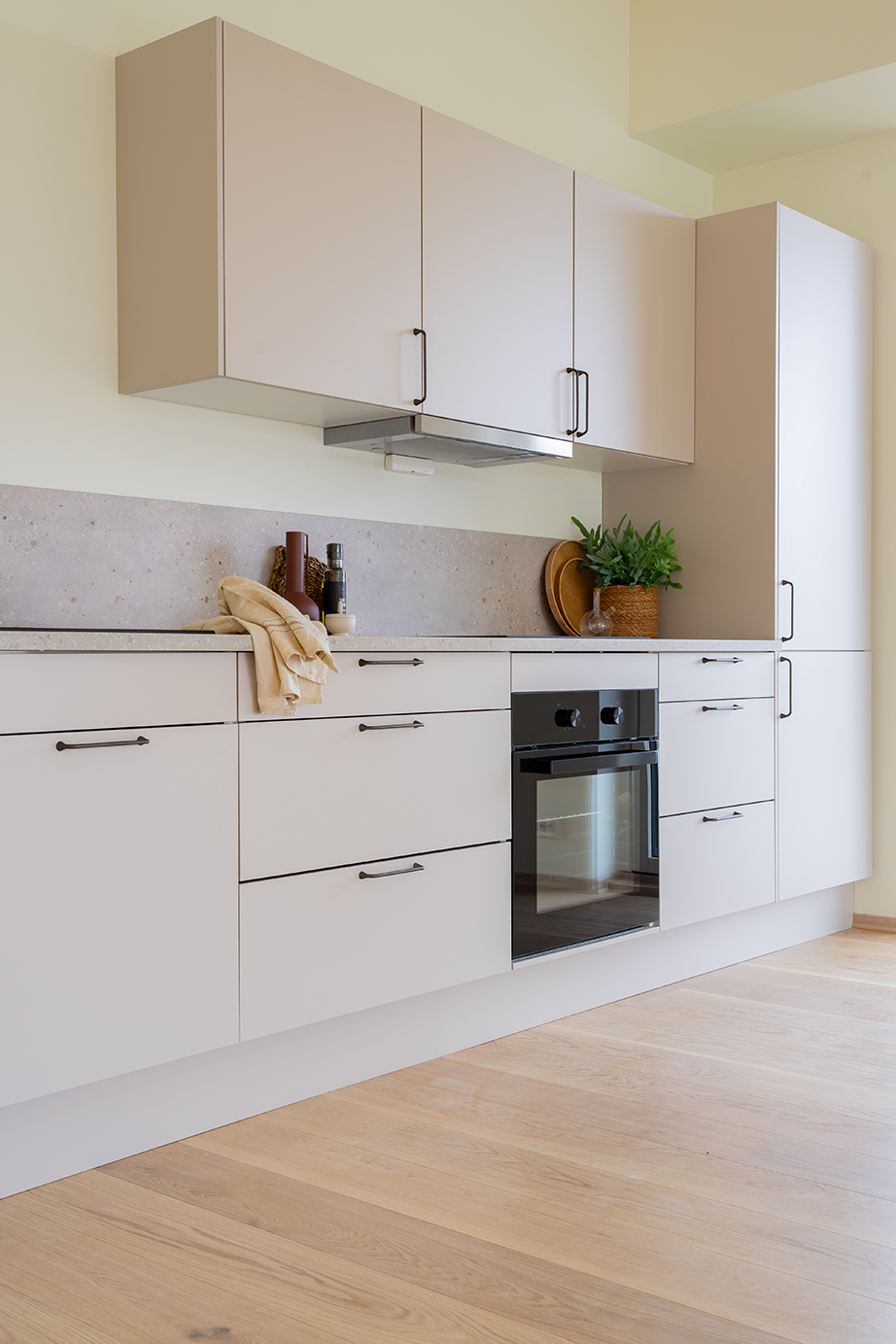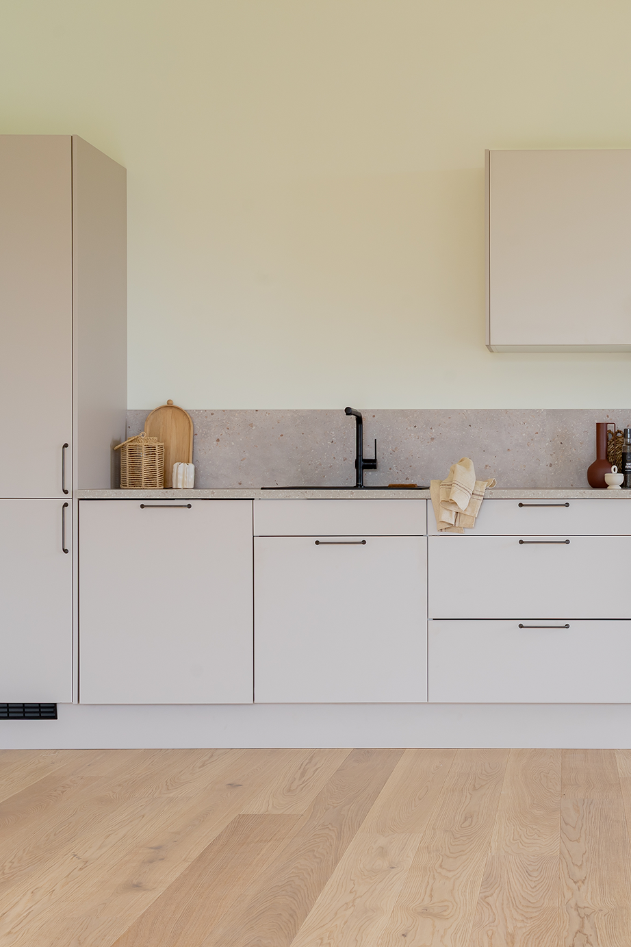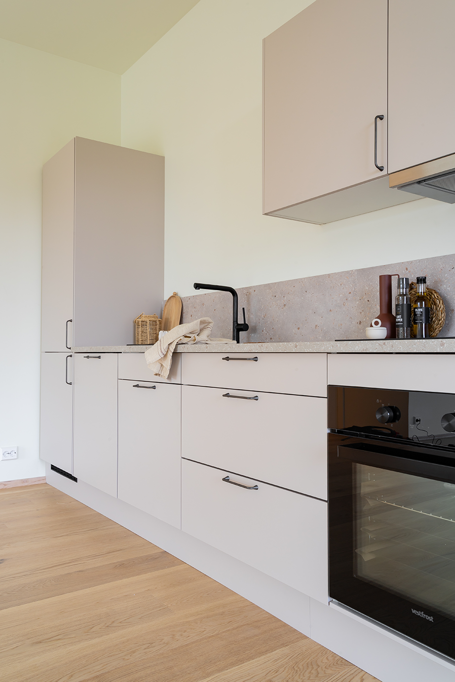 Sjøsanden kjøkken kjennetegnes av sine rene, matte fronter med en myk og harmonisk fargetone. Frontene er utviklet for å gi et moderne, men samtidig varmt uttrykk. Dermed kan de enkelt kombineres med ulike materialer og interiørstiler. Med en slett og elegant overflate får du et kjøkken som oppleves rolig og visuelt sammenhengende. Det gjør at Sjøsanden kjøkken er perfekt for både små og store rom.